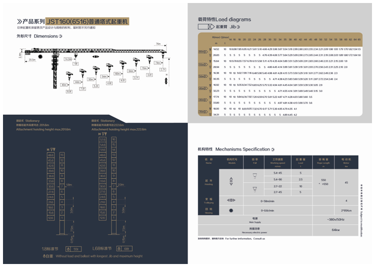 2. 塔顶安装调试低:平头式塔机的无拉杆设计降低了塔顶高度,特别适合于群塔交叉作业,大大地提高了塔机的作业效率。通过更换或增减一些部件及辅助装置,塔机可获得独立式和附着式等工作方式,以满足不同的使用要求。